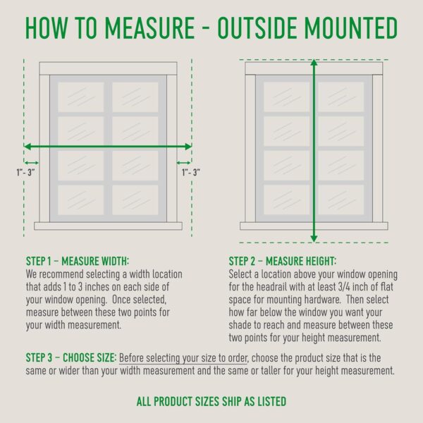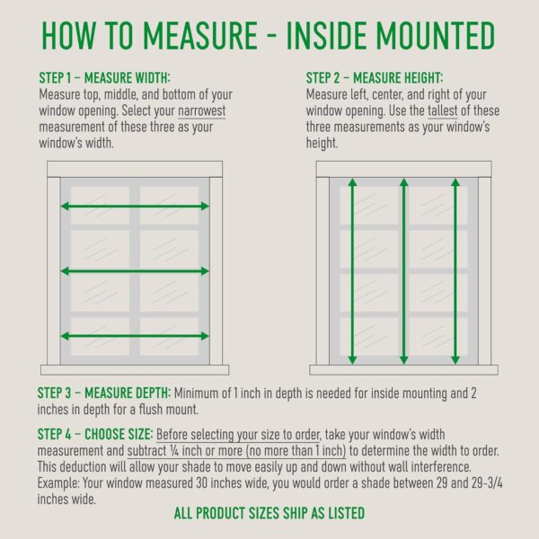 • – – No hacemos deducciones. Para un soporte interior, por favor, pide un parasol de ventana que sea al menos 1/4 pulgadas más pequeño que el ancho de tu ventana.