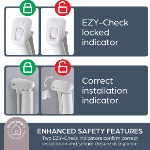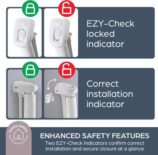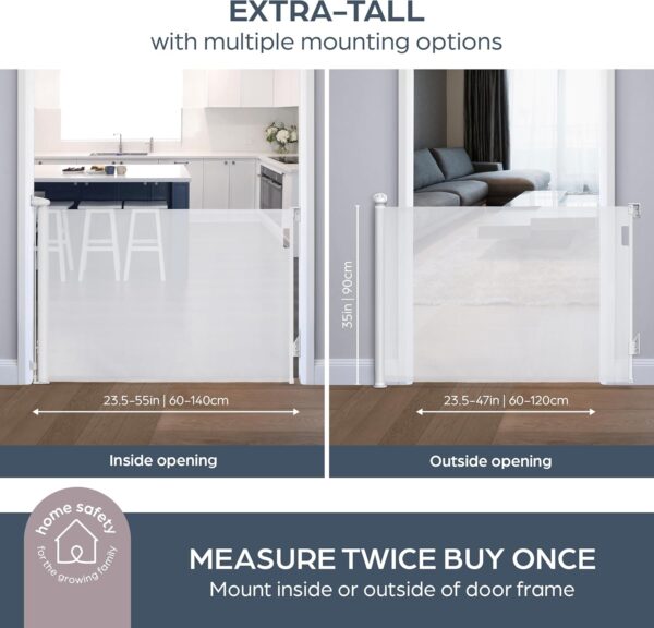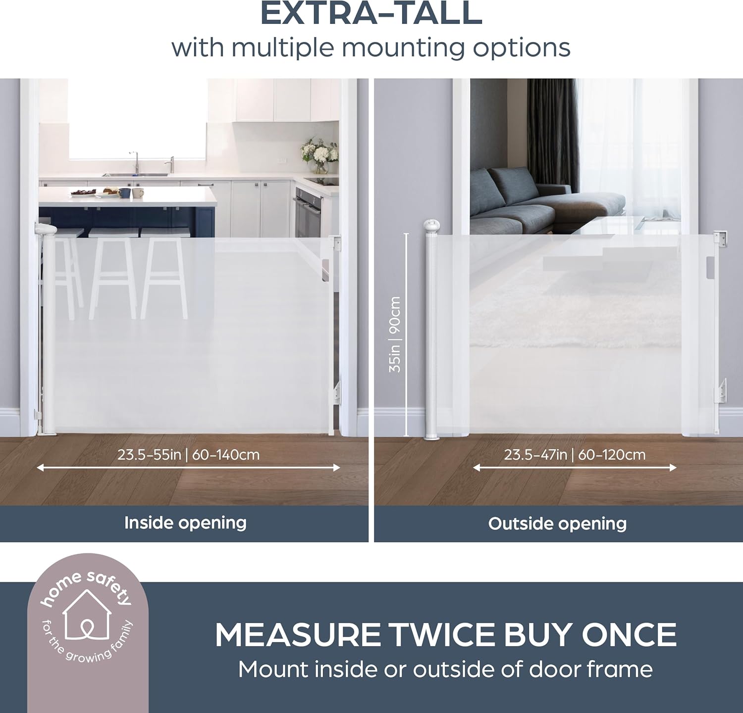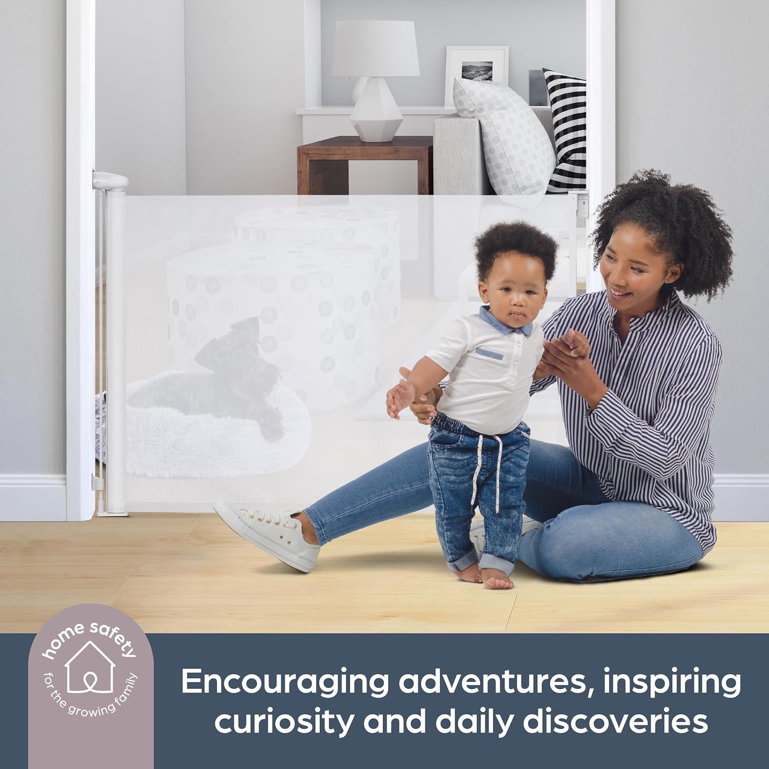 Dreambaby Puerta retráctil para bebés: está diseñada con precisión y cuidado, esta versátil puerta para niños o mascotas es perfecta para una multitud de colocaciones, ya sea que necesite una puerta retráctil para bebés para las escaleras o una puerta extra ancha para pasillos. Su perfecta integración en su hogar lo convierte en una opción ideal para familias modernas que buscan comodidad y seguridad. La construcción de malla es suave pero duradera sin comprometer la resistencia. La puerta retráctil de malla Dreambaby es eficiente en el espacio. Su diseño retráctil permite que se enrolle fácilmente, manteniéndose fuera de tu camino cuando no está en uso, preservando así el flujo y la funcionalidad de tu espacio vital. Esta característica lo convierte en una excelente opción para áreas de alto tráfico como escaleras y puertas, donde una puerta de bebé tradicional puede resultar engorrosa. Nuestra puerta infantil para escaleras está equipada con 2 indicadores EZY-Check. Estos indicadores intuitivos cuentan con distintos colores rojo y verde y proporcionan una confirmación visual de la instalación correcta y el cierre seguro. La puerta retráctil Hide ‘N Glide se extiende hasta un ancho extra de 55 pulgadas y mide 35 pulgadas de alto. La puerta es adecuada para su uso en la parte superior o inferior de escaleras, en puertas o pasillos y se puede montar dentro o fuera de marcos de puertas. Esta puerta infantil para escaleras es una opción flexible y confiable y puede servir como puerta para bebés o mascotas para uso en exteriores o interiores. * Si la puerta se utiliza al aire libre, llevar adentro y mantener fuera de la lluvia, granizo, nieve o bajo condiciones de congelación. Ya sea que necesites una puerta para bebés para escaleras, una puerta retráctil para perros o una solución versátil tanto para niños como para mascotas, la puerta retráctil Dreambaby para bebés funcionará. Crea límites protectores, tranquilidad y espacio para jugar y explorar con la puerta retráctil para bebés Glide ‘N Hide de Dreambaby.