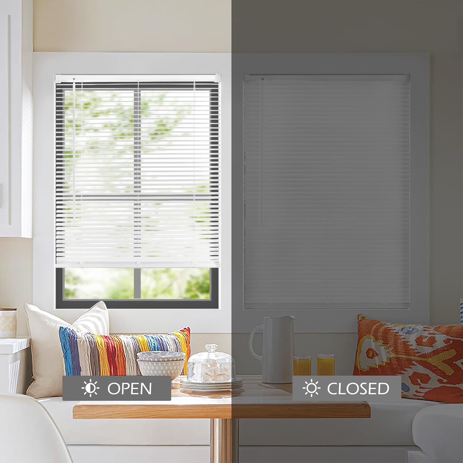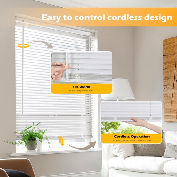 - Filtrado de luz: cambia entre el filtrado de luz o el oscurecimiento de la habitación utilizando la varita giratoria. La varita inclinable hace que las lamas giren 180 grados para controlar la luz, bloquear los rayos UV y proporcionar privacidad. Perfecto para sala de estar, habitación familiar, dormitorio, baño.