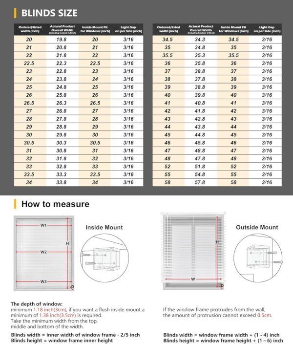 - El ancho de las persianas será de 3/8 pulgadas más estrecho para una instalación interna cómoda. El tamaño real de las persianas es de 19 5/8 pulgadas de ancho x 64 pulgadas de alto. Elige el tamaño mismo o más cercano al ancho de tu ventana para montaje interior. Por ejemplo, si el ancho de tu ventana es de 30 pulgadas, pide 30 pulgadas o un poco menos para la instalación interna. Para montaje exterior, recomendamos pedir (2-4) pulgadas más ancho que el ancho de tu ventana para una mejor cobertura.