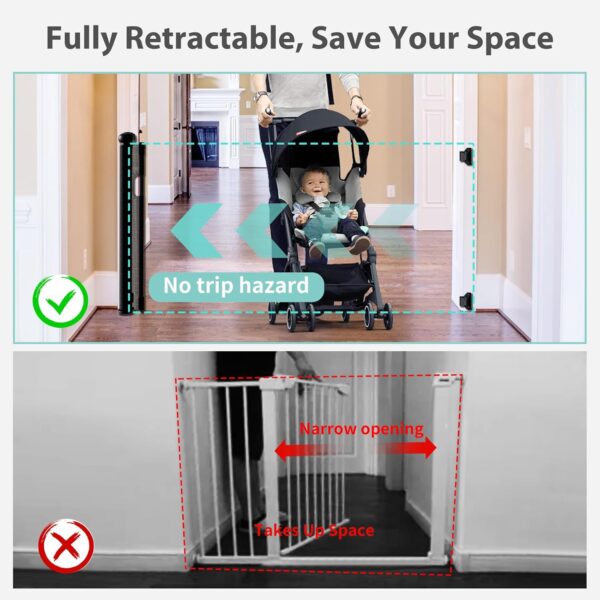 - Amplia aplicación: de 33 pulgadas de alto y 55 pulgadas de ancho, esta puerta retráctil para perros es perfecta para una variedad de lugares, incluyendo escaleras, puertas, cocinas, jardines, dormitorios y salas de estar, tanto en interiores como en exteriores. Su diseño de malla proporciona un ambiente seguro, asegurando seguridad y entretenimiento para tu bebé y mascotas. Evita la instalación en zonas húmedas o húmedas.
