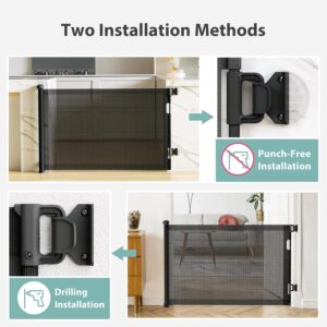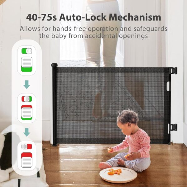 Puertas retráctiles para bebés sin perforaciones para escaleras con bloqueo automático, 33 x 55 pulgadas de malla para bebés, perros, mascotas y gatos con doble bloqueo para puertas