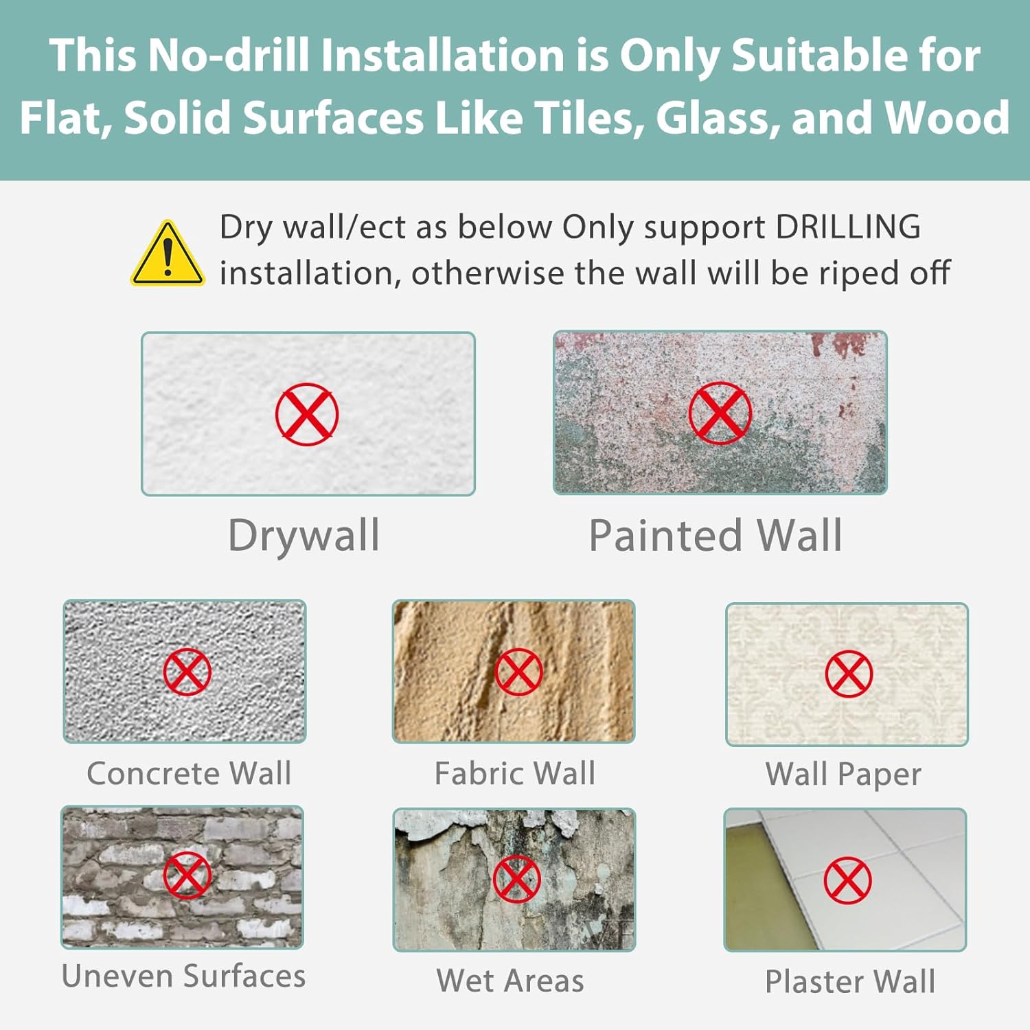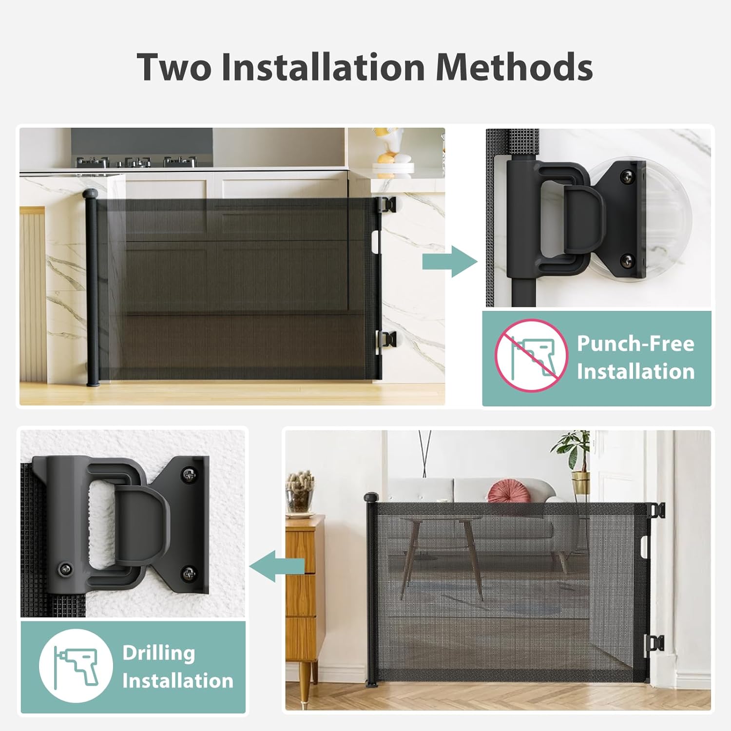 - Adecuado para casi todas las paredes: esta puerta retráctil para bebés cuenta con opciones de instalación flexibles diseñadas para varias superficies de pared. La instalación sin taladro es perfecta para azulejos, madera lisa, vidrio y paredes de metal. Para paneles de yeso, paredes de madera, placas de yeso, hormigón, ladrillo y otras superficies, recomendamos la instalación de perforación para una seguridad óptima.