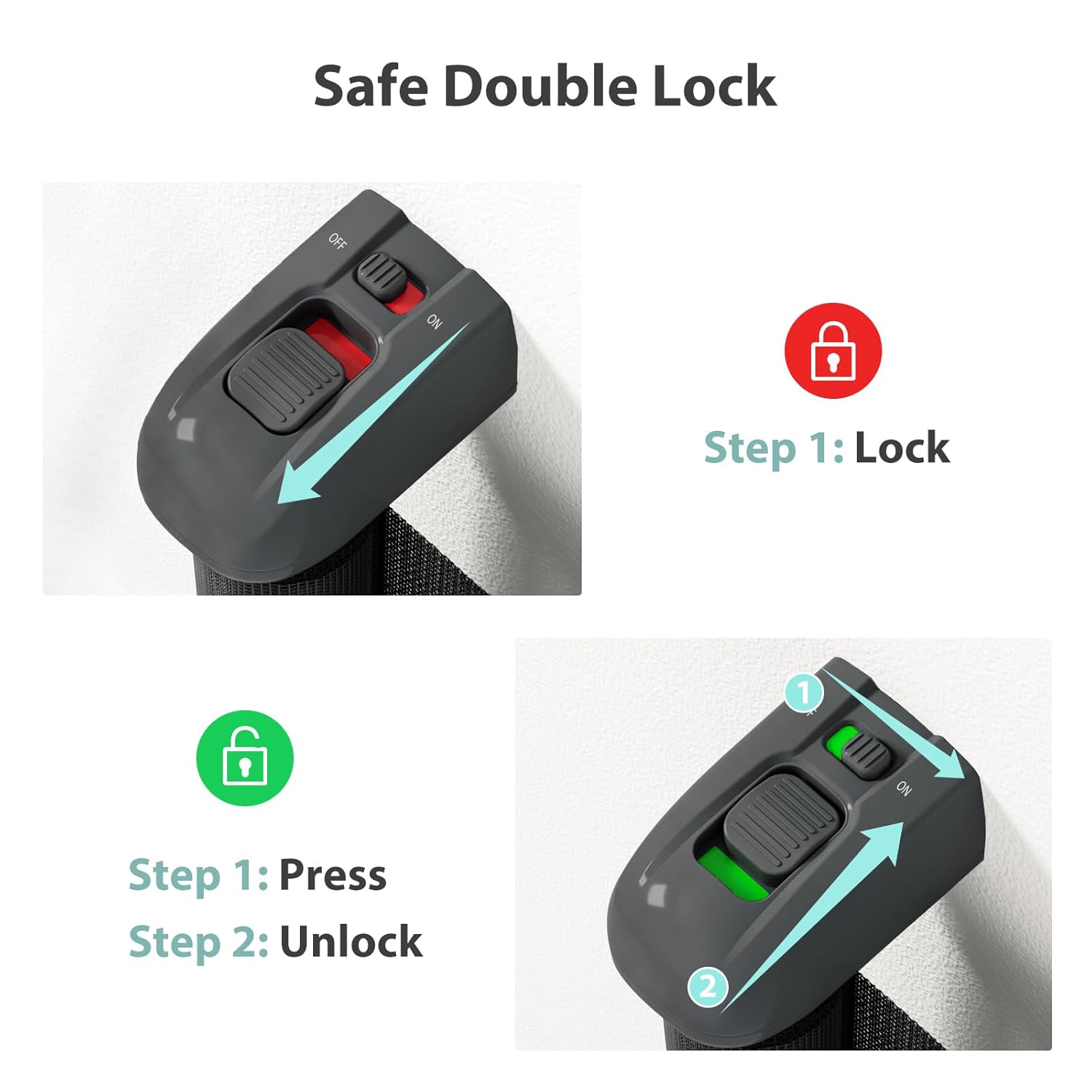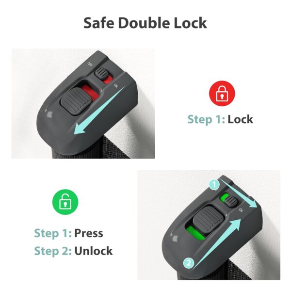 - Cerradura doble de seguridad: este innovador diseño de doble bloqueo mejora la seguridad al evitar que su hijo desbloquee fácilmente la puerta, manteniéndolo a salvo de acceder a la cocina o subir escaleras sin supervisión. Si bien las cerraduras dobles son fáciles de operar para los adultos, siguen siendo difíciles de desbloquear para los más pequeños, lo que te proporciona tranquilidad.