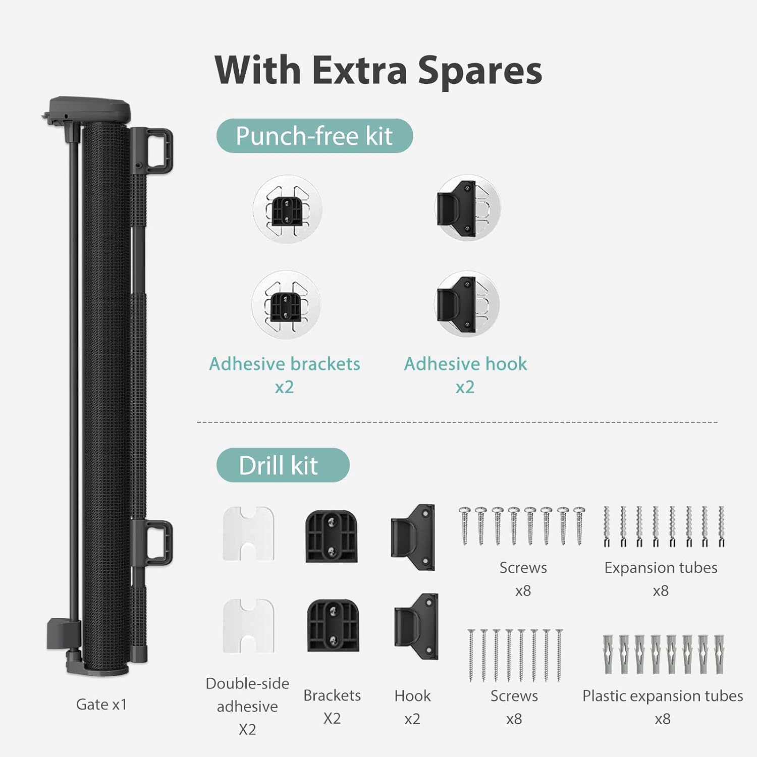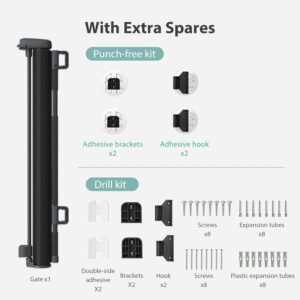 - Instalación 2 en 1 sin taladro y taladro: nuestras puertas retráctiles para bebés ofrecen dos métodos de instalación convenientes: sin taladro y perforación tradicional. Este diseño garantiza la compatibilidad con casi todos los tipos de pared. La opción sin taladrar combina simplicidad y versatilidad mientras protege tus paredes, proporcionando una solución sin complicaciones para varias superficies de pared.