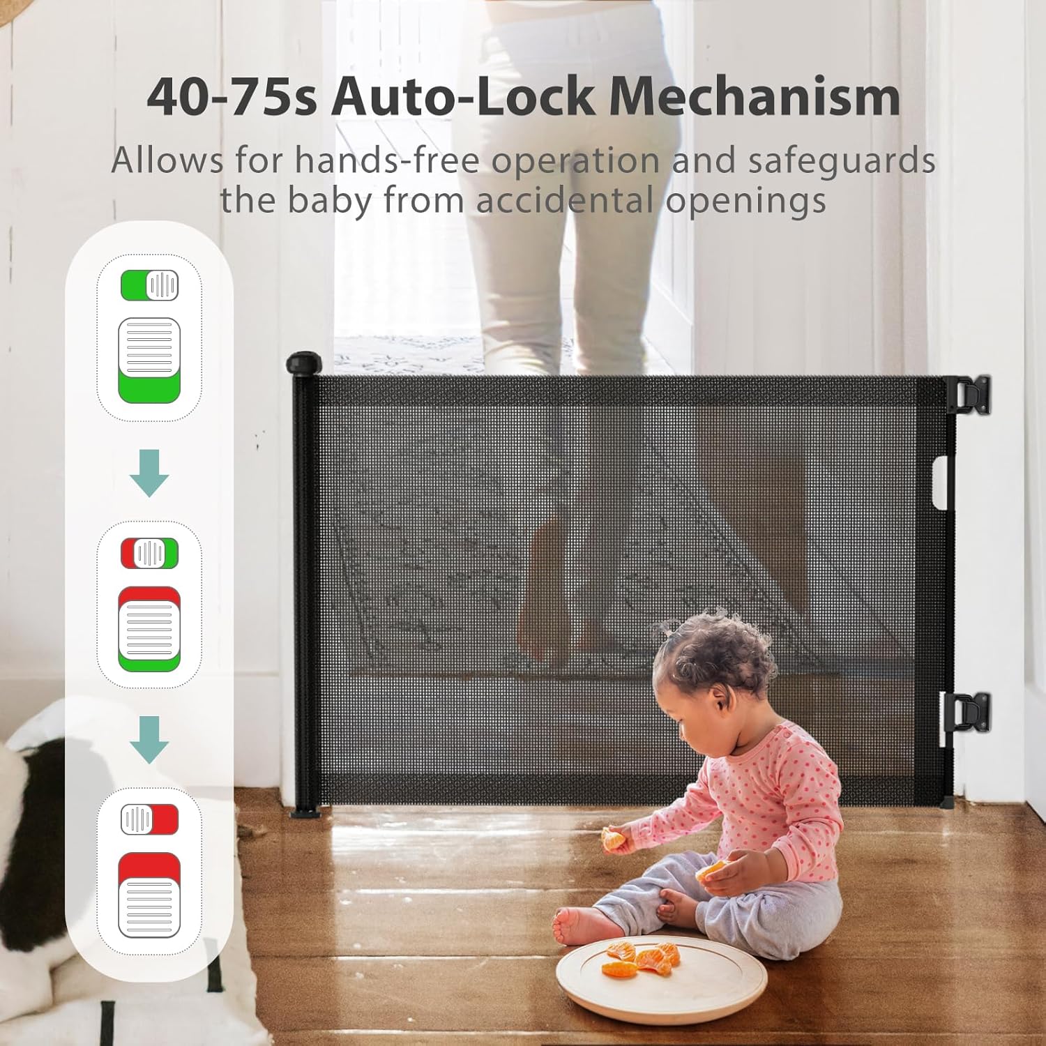 - Bloqueo automático inteligente: esta puerta para bebés cuenta con una función de bloqueo automático mejorada que se activa en 40 a 75 segundos. Permite una operación con una sola mano mientras sostiene a tu bebé, asegurando un cierre seguro en todo momento. Con nuestro confiable sistema de bloqueo automático, puedes estar tranquilo sabiendo que la puerta está cerrada de forma segura, ahorrándote tiempo y preocupaciones.